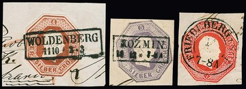 Oktogon-Ganzsachen-Ausschnitte, 4 Sgr. rotbraun (Ra2 "Woldenberg", Bugspur), zweimal 5 Sgr. purpur, mit Ra2 "Kozmin" bzs. "Ortelsburg", sowie 7 Sgr. ziegelrot mit K2 "Friedeberg i. Schl.", gesamt vier Briefstücke mit achteckig geschnittenen Oktogon-Ausschnitten. Mi. 1800,-
