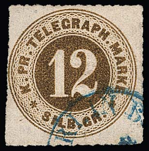 Telegraphenmarke 12 Sgr. graubraun mit typischem blauem K1 "Berlin B." (Telegraphenstation der Börse) als Teilabschlag, dieser Stempel ist auch rückseitig auf Telegrammen belegt. Es sind etwa zehn gestempelte Telegraphenmarken registriert, von denen ein Großteil in sehr fehlerhafter Erhaltung (u.a. rundgeschnitten) ist. Insofern ist das vorliegende Exemplar mit kleinen Mängen (u.a. links nachgestochen) eine der weit überdurchschnittlich erhaltenen gebrauchten Telegraphenmarken, wie auch das Attest Wasels bestätigt: "... seltene Marke in weit überdurchschnittlicher Erhaltung ... gebrauchte Exemplare der Telegraphenmarken sind nur in einer ganz kleinen Zahl bekannt geworden und gehören zu den Raritäten des Sammelgebietes Preussen". Mi. "-.-", ferner sign. Deilakis