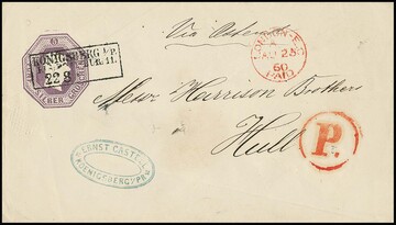 Oktogon-Ganzsache 5 Sgr. purpur, frisches und prachtvolles Couvert (min. Knitterspuren unten bzw. kl. Aktenspieß = typisch) mit besserem Ra3 "Königsberg i.P. Eisenbahn-Bur. 11" 1860 nach Hull/England, bekannte Korrespondenz, aus der 24. Kruschel-Auktion 1985, Mi. 650,-