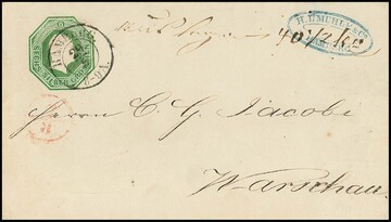 Oktogon-Ganzsache 6 Sgr. grün, seltenes Couvert (unbedeutende Reinigungs- und Glättungsspuren) mit K2 "Hamburg" nach Warschau/Polen gelaufen (bekannte Korrespondenz an die dortige Mühle Jacobi), aus der 272. Köhler-Auktion 1991, sign. Starauschek und Attest Wasels. Mi. 1100,-