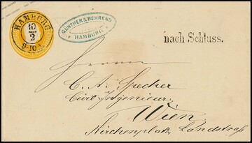 Kopf-Ganzsache 3 Sgr. gelb, Prachtcouvert mit K2 "Hamburg" und seltenem Neben-L1 "nach Schluss" nach Wien
