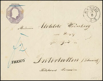 Oktogon-Ganzsache 5 Sgr. purpur im seltenen Großformat gebraucht mit K2 "Danzig" nach Interlaken/Schweiz, kleine Mängel, Mi. 1100,-