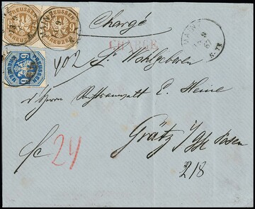 6 Kr. blau und Paar 9 Kr. braun (min. "eckrund") auf gef. Einschreibebrief der 2. Gewichtsstufe von Mainz nach Grätz bei Posen