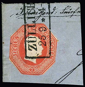 Oktogon-Ganzsachen-Ausschnitt 7 Sgr. ziegelrot, typisch achteckig geschnitten, auf Briefstück mit Ra2 "Züllichau", Mi. 500,-
