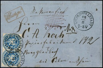 6 Kr. hellpreußischblau, seltene Nuance, im Kabinettpaar auf Einschreibebrief mit klaren nachverw. K1 "Niederwöllstadt" nach Berg. Gladbach bei Köln. Mi. 2500,-, Attest Brettl "ein schöner Brief in der seltenen Farbnuance."