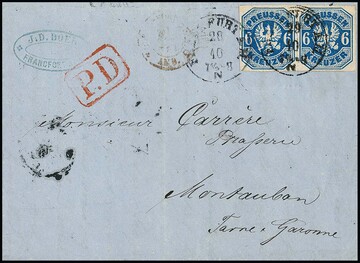 6 Kr. mittelblau, gute Farbe, im waagerechten Paar auf sauberem Faltbrief von Frankfurt 1867 nach Frankreich. Lt. Attest Brettl ist lediglich im Oberrand "eine leichte Druckspur geglättet", lt. Attest Jäschke-L. ist der Rand oben angesetzt. Ferner tadellos sign. Bühler. Mi. 2900,-