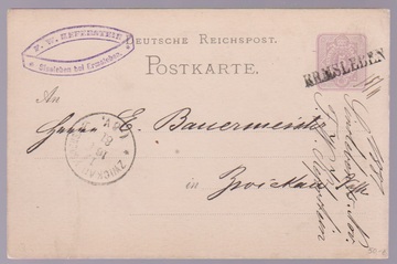 "Ermsleben", spät nachverw. preuß. L1 noch 1881 bei der Bahnpost verwandt auf 5 Pfg.-Postkarte (Einriß)