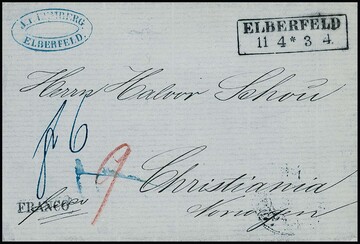 "Elberfeld", Ra2 1856 auf frischem und sehr seltenem Brief der doppelten Gewichtsstufe nach Christiania/Norwegen