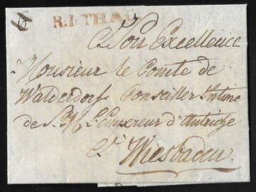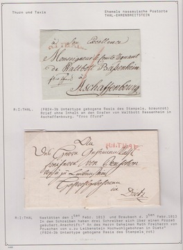"Ehrenbreitstein", 1813 ff., je roter L1 "R.I. THAL" (Feuser 824-4) auf fünf Briefen (teils Hüllen), u.a. aus Nastätten