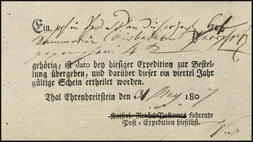 "Ehrenbreitstein", 1807, seltener Ortsdruck-Postschein "Thal Ehrenbreitstein fahrende Post=Expedition hieselbst" ("kaiserl. Reichs-Postamt" gestrichen)