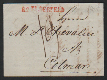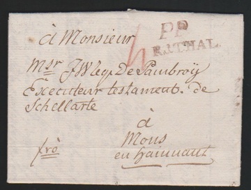 "Ehrenbreitstein", 1804, innen "Campo rive droite du Rhin au dessris de Coblence" (weiter interessanter Text), roter L1 "R.1. THAL.", "PP" dazugesetzt, auf Brief nach Mons