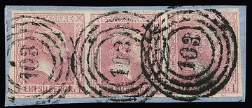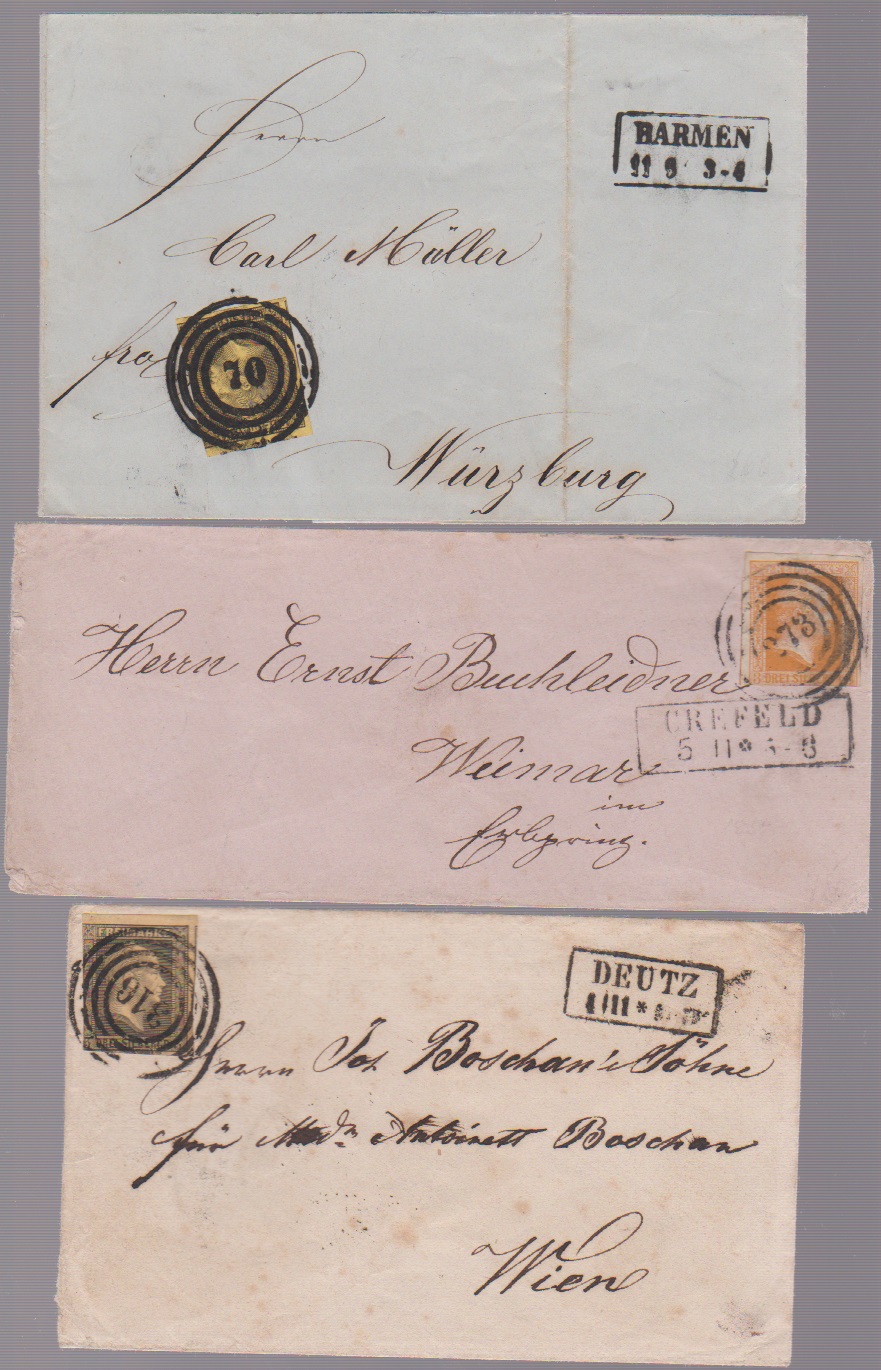 "70" nebst Ra2 "Barmen", "273" nebst Ra2 "Crefeld", sowie "316" nebst Ra2 "Deutz", drei Briefe 3 Sgr. (teils etwas ber.)