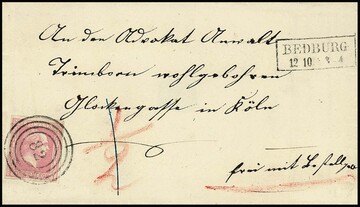 "82" nebst Ra2 "Bedburg" auf Brief 1 Sgr., "frei mit Bestellgeld" nach Köln, Marke links unten Riß, aber auf Brief sehr seltener Rheinland-NS, Attest Flemming