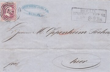 "103" nebst Ra3 "Berlin Stadtpost-Exp. XII" auf Ortsbrief mit Einzelfrankatur 1 Sgr. rosa (kl. Spalt)