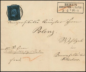 "105" nebst Ra3 "Berlin Anhalter-Bahnh." auf Couvert mit perfekter 2 Sgr.