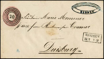 "70" als Wertstempel-Entwertung, Ra2 "Barmen" nebengesetzt, auf Ganzsache 1 Sgr. rosa (oben Absenderstempel unkenntlich gemacht) nach Duisburg, Mi. 400,-