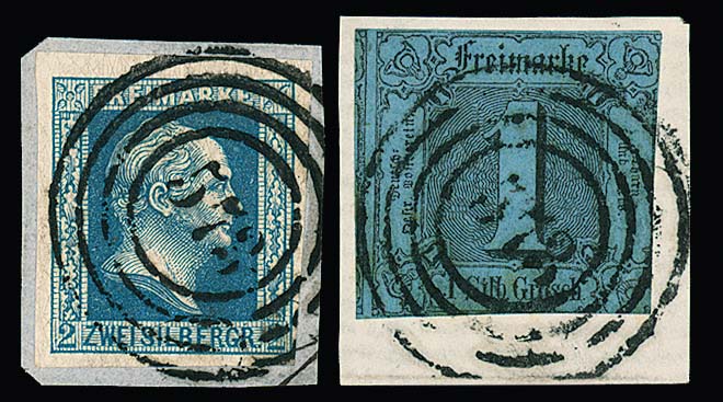 "573" (Bahnpost Halle) auf Briefstück 2 Sgr. blau (gut), sowie zweimal als Fremdentwertung auf Taxis 1 Sgr.