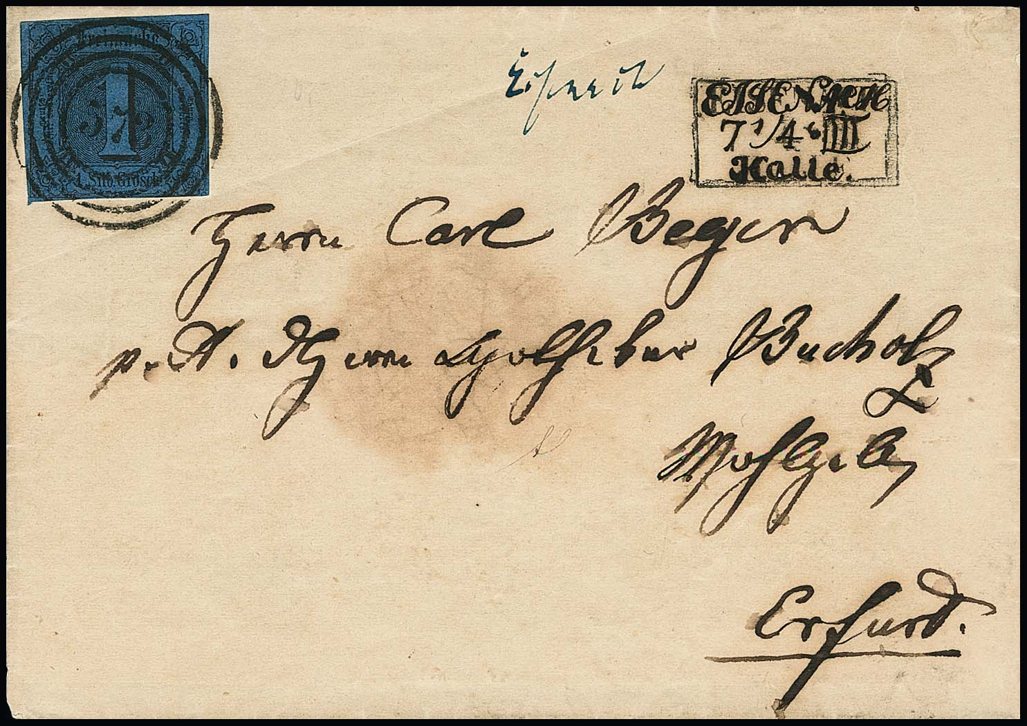 "573" nebst hs. Bahnpost-Aufgabe "Erfurt" und Zug-Ra3 "Eisenach-Halle" (hs. zeitgenössisch nachgezogen) auf Faltbrief (ohne Seitenklappen) mit Taxis 1 Sgr. schw./blau, sign. Sommer, seltene Fremdentwertung