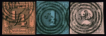 "573" (Halle Bahnpost), drei versch. Typen je als Fremdentwertung auf Taxis 1/4, 2 und 1 Sgr.