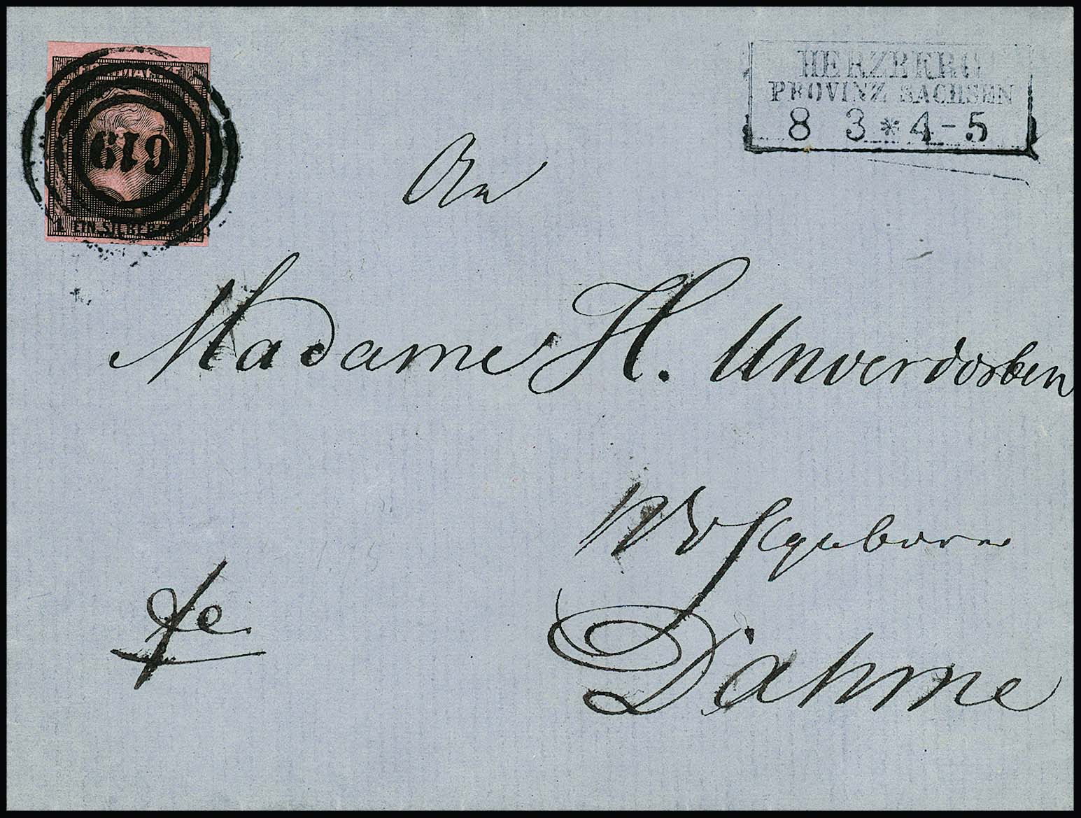 "619" zentrisch nebst Ra3 "Herzberg Provinz Sachsen" auf Kabinettbrief 1 Sgr.
