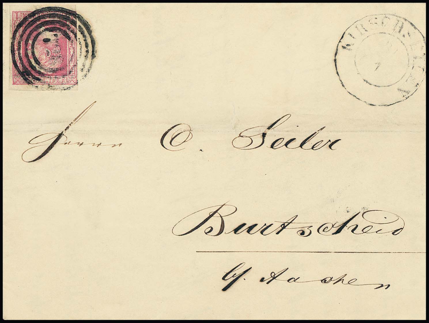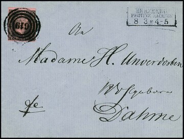 "728" nebst K2 "Kirschseifen" auf Brief mit 1 Sgr. karmin (winzig berührt, Brief in der Mittelfalte kl. Mgl.), seltener Eifel-NS (Feuser + 700,-)