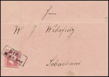 "727" nebst Ra2 "Kirn" auf Kabinettbrief 1 Sgr., sowie weiterer Brief aus gleicher Korrespondenz, jetzt vom 15.4.1859 mit 1 Sgr. rosa, diese mit Ra2 "Kirn" (dekor. rosa Brief)