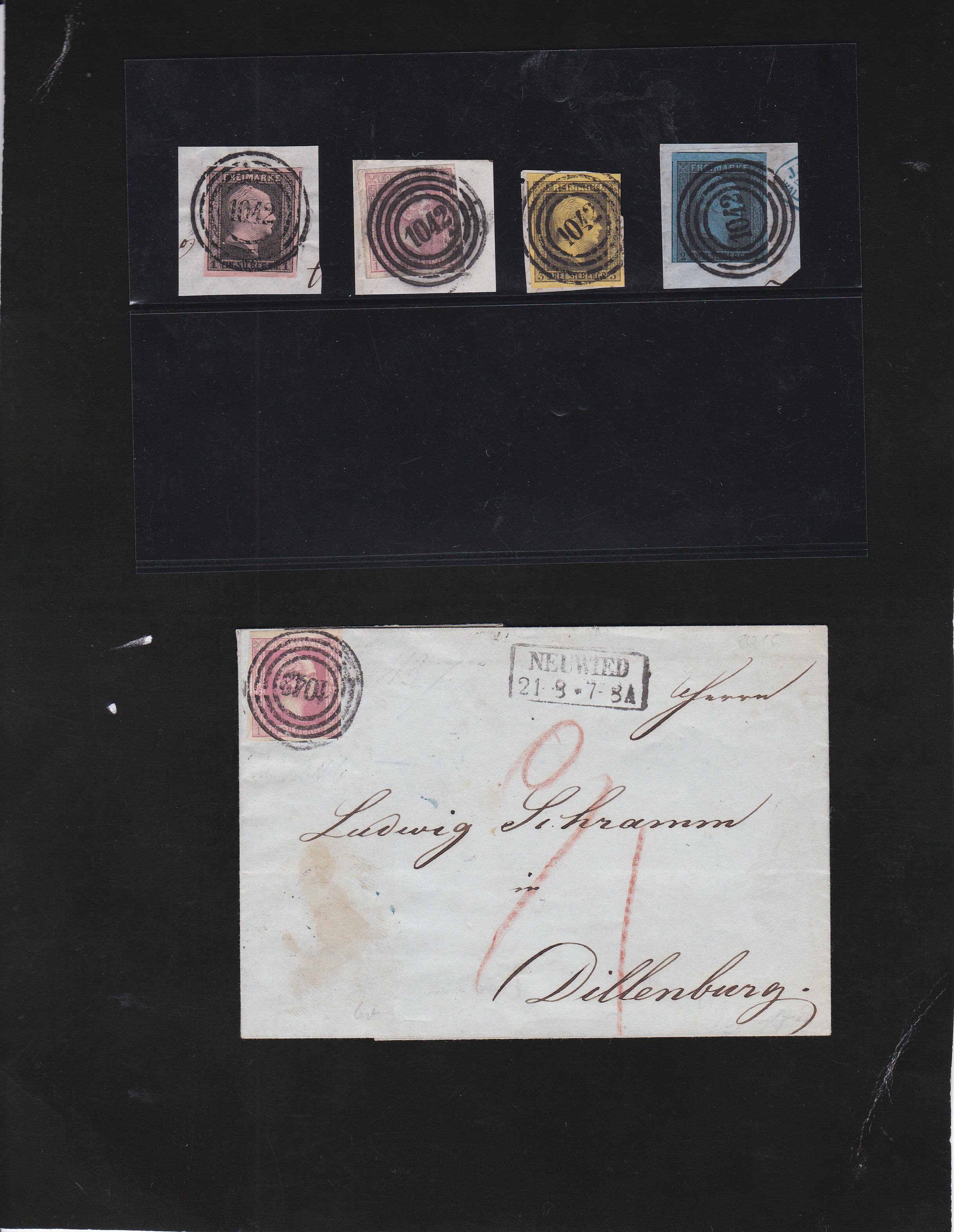 "1042" nebst Ra2 "Neuwied" auf Brief 1 Sgr. (Nr. 6ax), sowie vier Briefstücke inkl. 1 Sgr. Gittergrund