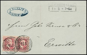 "975" nebst Ra2 "Mülheim a. Rhein" klar auf Faltbrief mit breitrandigem Paar 1 Sgr. (linke Marke bereits mit unauffälliger Vorfaltspur im Rand aufgeklebt)