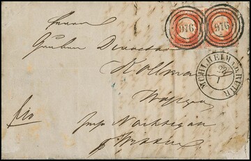 "976" nebst vorphil K2 "Mühlheim a.d. Ruhr" auf Faltbrief (dieser Papiermängel) mit zwei tadellosen 1/2 Sgr.