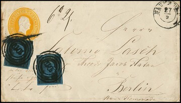 "1019" nebst K2 "Neumarkt" auf Ganzsache 3 Sgr. orange (links etwas Randbräune), als Paketbegleitung mit Zusatzfrankatur von zwei tadellosen 2 Sgr. nach Berlin