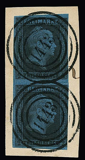 "1443" (Stolp) sehr klar auf dekor. Briefstück mit Paar 2 Sgr. (untere Marke rechts Randlinienschnitt), sign. Kastaun