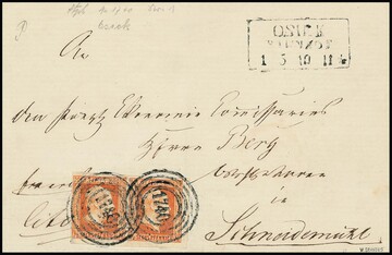 "1740" nebst Ra3 "Osiek Bahnhof" klar auf Brief mit Kabinettpaar 1/2 Sgr. ziegelrot aus der rechten unteren Bogenecke, sign. Brandes