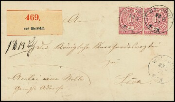 "MÖLLN I.L. EIS. POST-BUR", seltener Eisenbahn-Postübernahme-Ra2 ohne Datum als Entwertung auf zwei Ganzsachen-Postkarten Deutsches Reich 1/2 Gr. bzw. 5 Pfge.