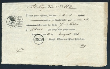 "Ratzeburg", 1836, "Königl. Dännemarkisches Post-Amt", seltener Fahrpostschein als Reco-Postschein verwendet, zwei Siegelstempel