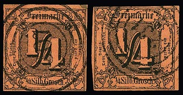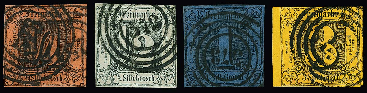 Vier versch. Werte erste Ausgabe (teils kl. Mgl.) je mit seltener Fremdentwertung durch preußischen NS "573" (Halle Bahnpost), dabei die gute große Type als Zusatzentwertung auf 1/4 Sgr., 1 Sgr. bestens sign. Brettl