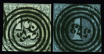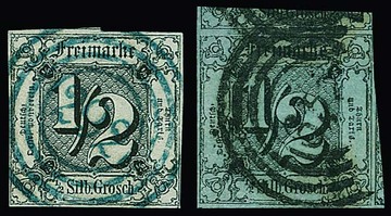 1/2 Sgr. schw./graugrün und 1 Sgr. schw./graublau, je weitgehend breitrandig, mit Fremdentwertung durch preußischen NS "573" (kl. Ziffern)