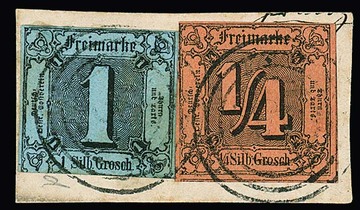 1/4 Sgr. schw./rotbraun, überrandiges Kabinettstück, nebst 1 Sgr. schw./graublau (diese gering fleckig) auf Briefstück, Fotoexp. Sem