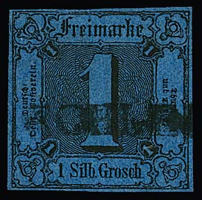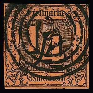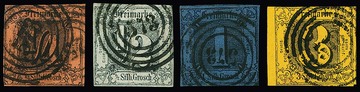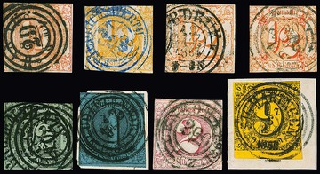 Acht Werte in unterschiedlicher Erhaltung, aber alle mit seltenen "Duplex"-Entwertungen durch sowohl NS als auch Ortsstempel, u.a. der seltene blaue NS ("358") und K1 von Friedrichswerth, "307"/Sigmaringen, Bremen usw.