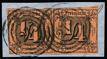 1/4 Sgr. schw./rotbraun im Paar auf Prachtbriefstück mit NS "273", rechte Marke weit überrandig mit Nebenmarken, linke nur links unten kurz berührt