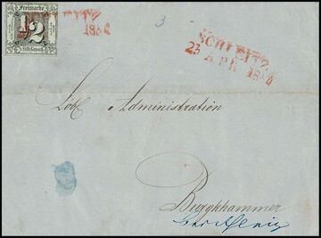 1/2 Sgr. schw./graugrün, weitgehend vollrandig, auf gefaltetem Prachtbrief mit rotem L2 "Schleitz" vom 23.4.1854 in den eigenen Landbezirk an das Hammerwerk in Burgkhammer bei Schleitz. Attest Sem