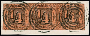 1/4 Sgr. schw./rotbraun im waagerechten Dreierstreifen im guten Taxisschnitt auf prachtvollem Briefstück mit NS "225", Mi. 240,-