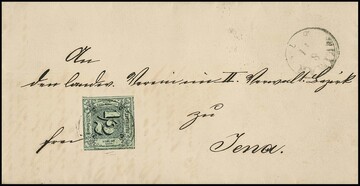 1/2 Sgr. schw./graugrün, teils hervorragend riesenrandig (fünf Nebenmarken an drei Seiten), auf Kabinettbrief von Weimar nach Jena