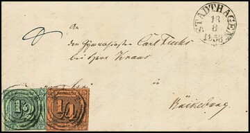 1/4 Sgr. schw./rotbraun in Kombination mit 1/2 Sgr. schw./blaugrün bzw. nächste Ausgabe 1/2 Sgr. grün, je guter Taxisschnitt, auf zwei Briefchen aus gleicher Korrespondenz 1858/61 mit NS "333" und K1 "Stadthagen" nach Bückeburg, hübsche Albumseite!