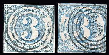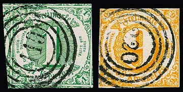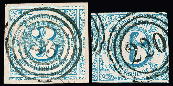 9 Kr. gelborange, weitgehend breitrandig, auf schwarz gerandetem Trauercouvert aus Frankfurt 1861, sowie 3 Sgr. rotbraun (kl. Spalt) auf Couvert von Greiz, "p. 6 1/2 U. bahnzug" (hs.) nach Brandenburg. Mi. 470,-