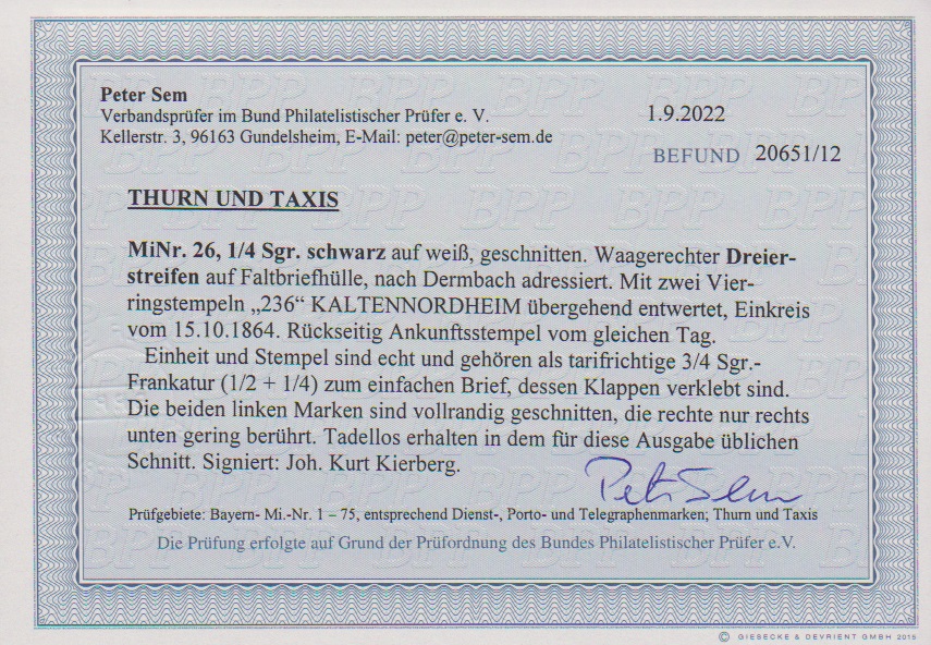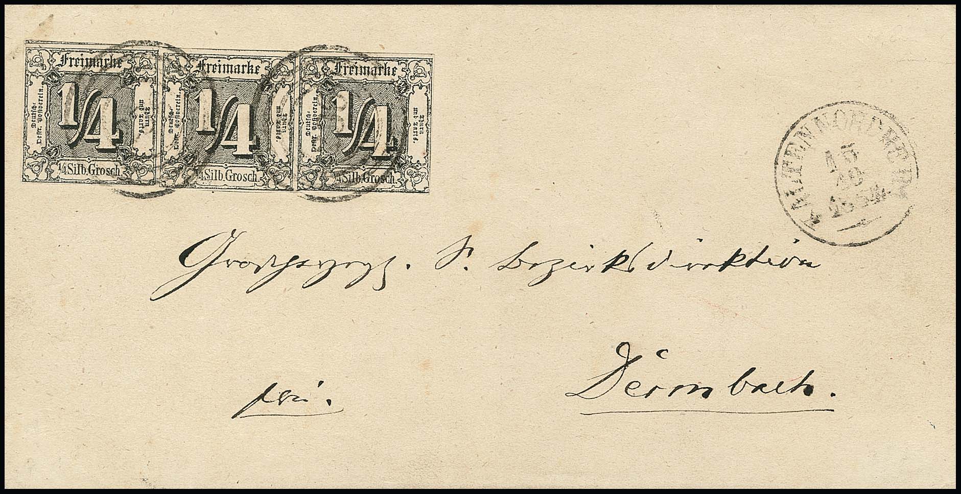 1/4 Sgr. schwarz, seltener waagerechter Dreierstreifen auf kpl. Faltbrief (rs. Klappen verklebt) mit NS "236" und K1 "Kaltennordheim" 1864 nach Dermbach. Das linke Paar des Streifens ist breitrandig, die rechte Marke nur rechts unten gering beührt. Sign. Kleeberg und Fotoexp. Sem: "Tadellos erhalten in dem für die Ausgabe üblichen Schnitt."