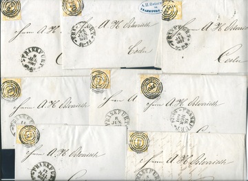 9 Kr. gelborange, neun frische Briefe (üblicher Taxisschnitt) aus einer Korrespondenz 1861 von Frankfurt nach Cöln, mind. dreimal Type I, Mi. 1900,- +