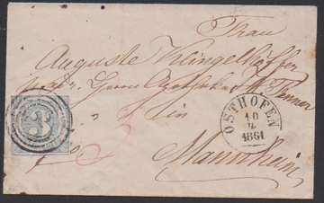 3 Kr. hellblau, vollrandiges Prachtstück auf leicht unfrischem Couvert aus Osthofen, sign. Sem