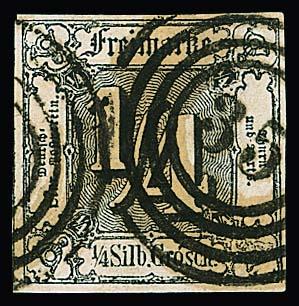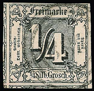 1/4 Sgr. schwarz, ungewöhnlicher Schnittriese, rechts vom Bogenrand, zwei Seiten Nebenmarken, sign. Drahn