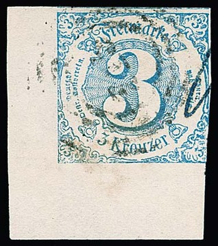 3 Kr. hellblau, große gestempelte linke untere Bogenecke, rechts unten berührt und leicht fleckig