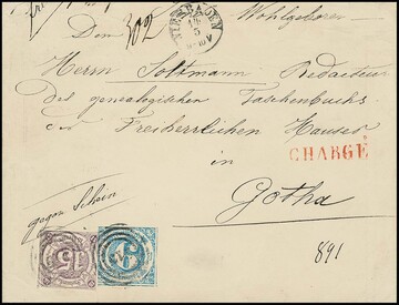 15 Kr. purpur und 6 Kr. hellblau, normal geschnitten, auf Chargébrief von Wiesbaden nach Gotha, Couvert rs. etwas verkürzt und Randfehler, aber sehr seltene 21-Kr.-Inlandsrate für 3. Gewichts- und 3. Entfernungsstufe